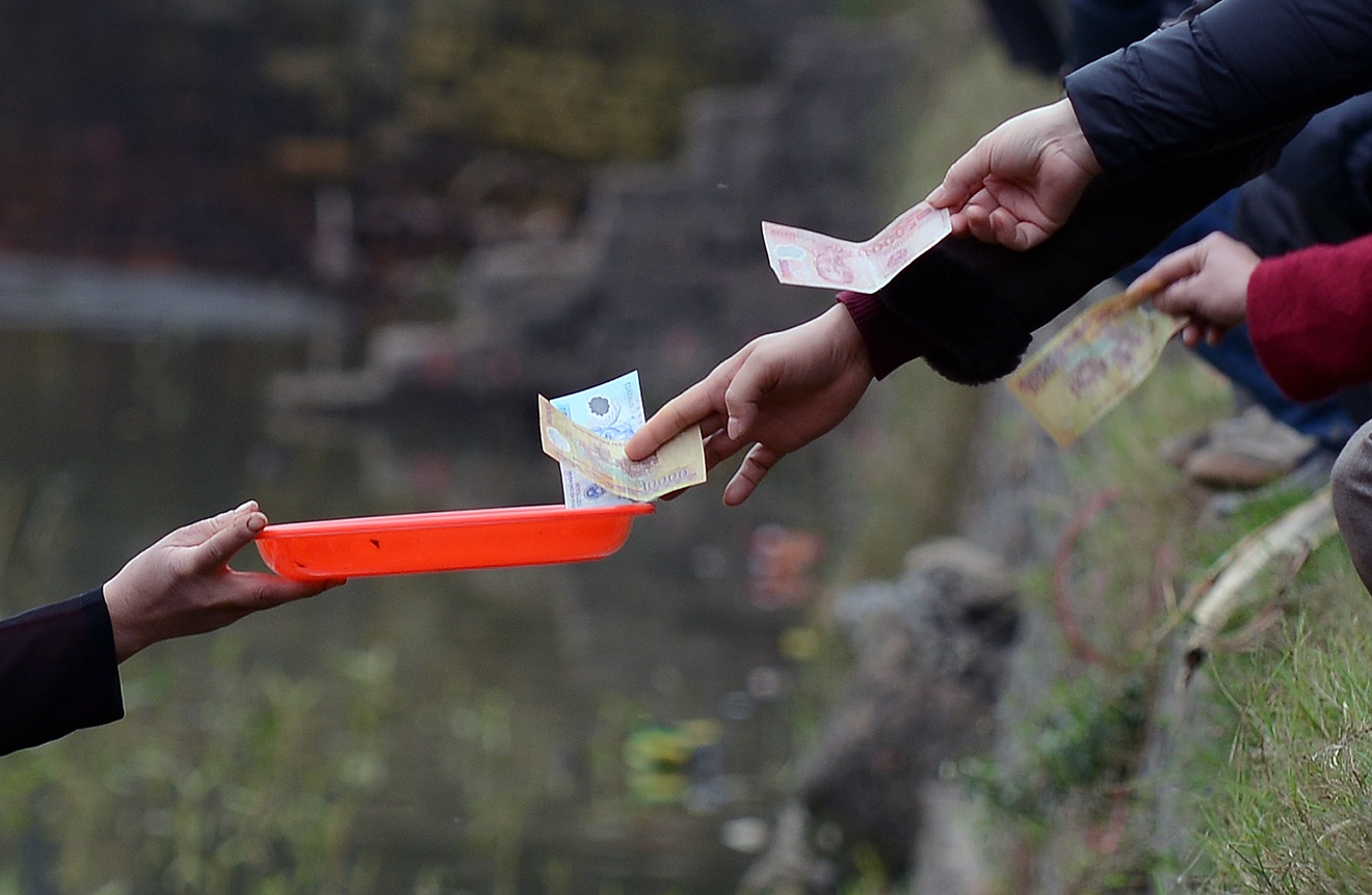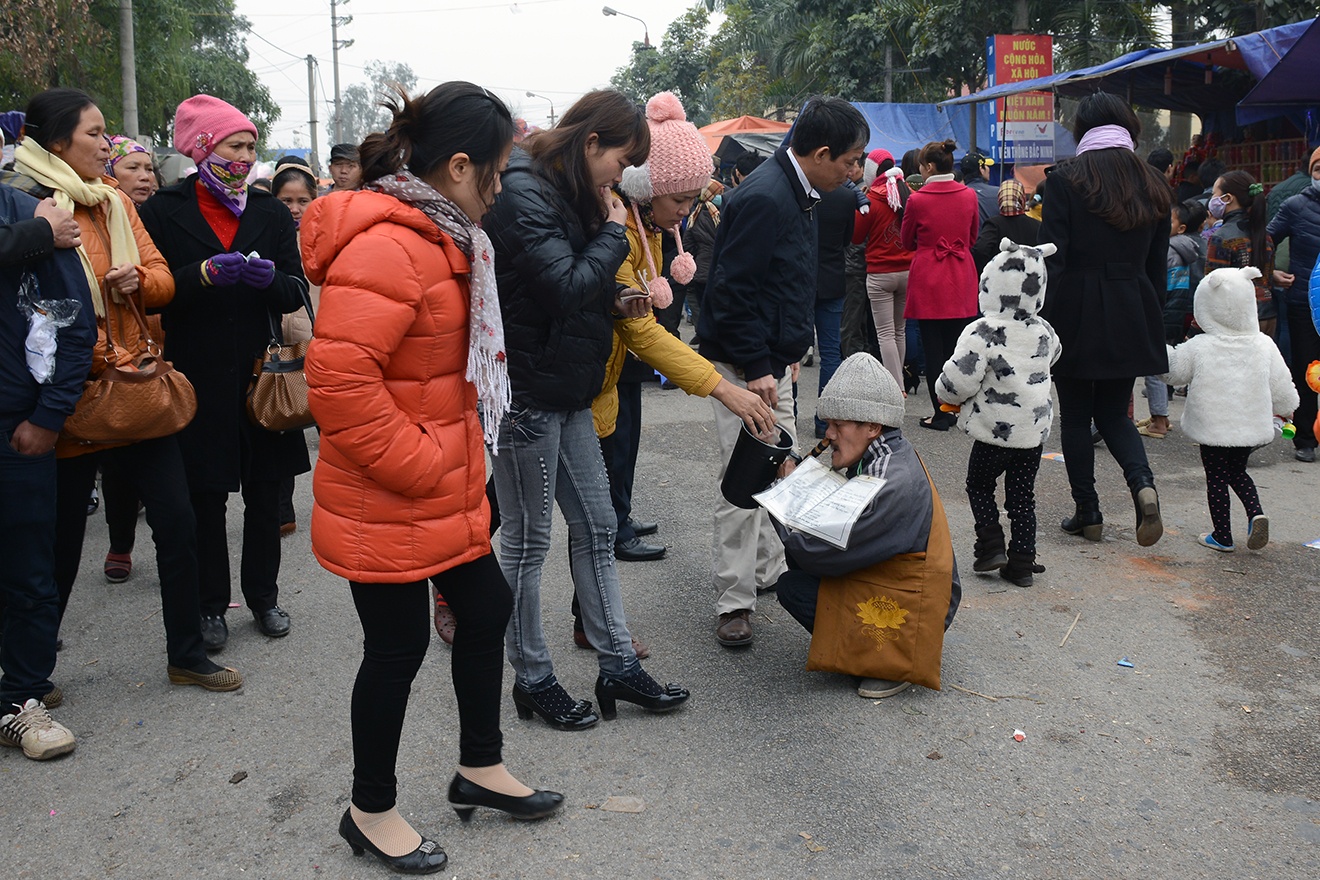 Lễ hội vùng Kinh Bắc sáng 12/2 có nhiều hình ảnh phản cảm khi du khách chen nhau tìm cách nhét tiền vào tay tượng Phật. Còn dưới hồ, các liền anh chị vẫn hát quan họ xin tiền.