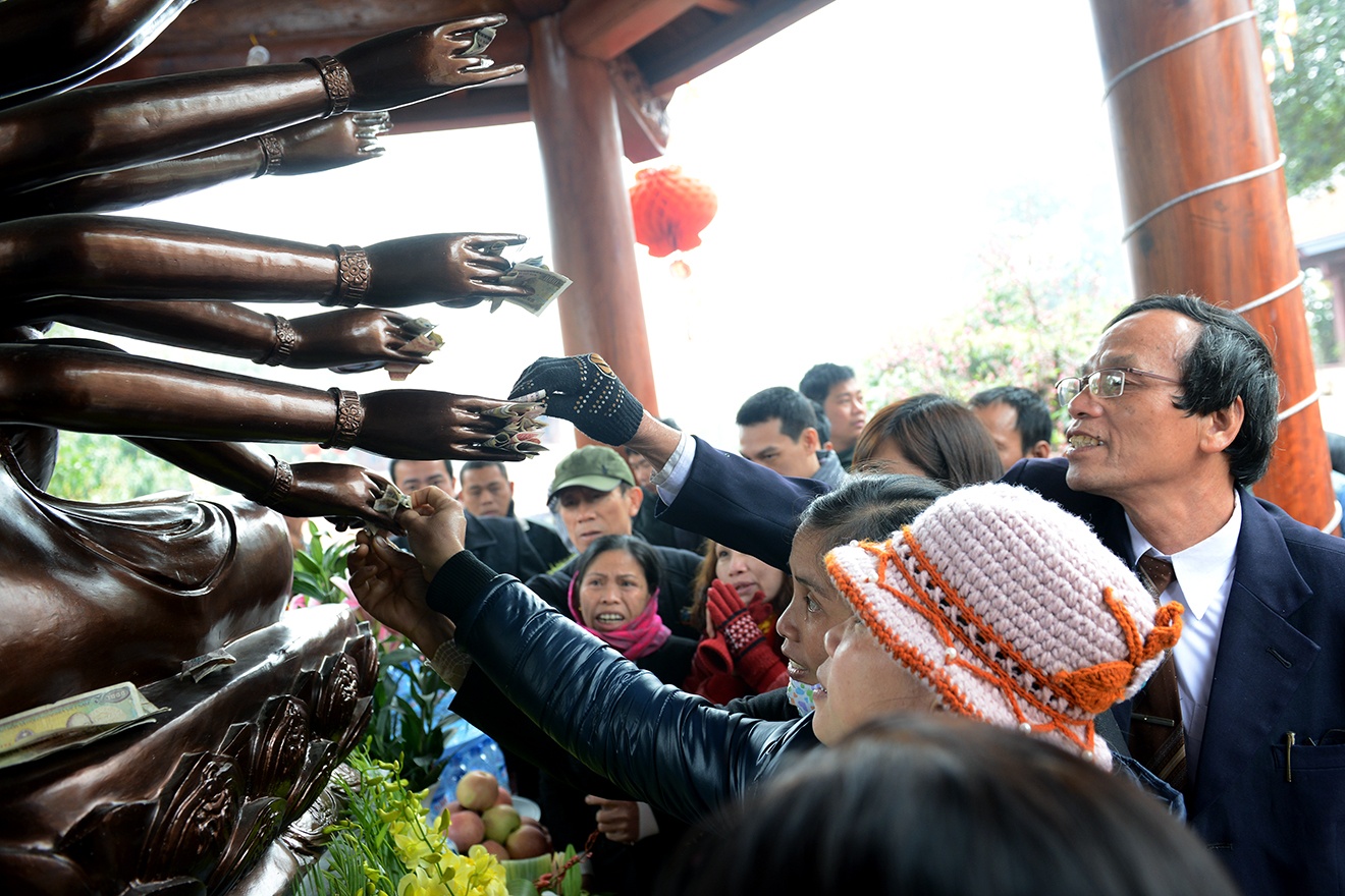 Tuy nhiên, trong một lần trả lời phỏng vấn Zing.vn, ông Vương Duy Bảo, Phó cục trưởng Cục Văn hóa cơ sở (Bộ VH-TT&DL) đã cho rằng việc mang tiền giắt vào tay tượng Phật, rải đầy dưới chân, dưới sàn là sự phỉ báng, hối lộ thánh thần. "Hiện tượng này là sự hỗn tạp bây giờ mới có. Người xưa luôn tâm niệm thần linh là một thế lực thiêng liêng của tầng trên, nên ứng xử với thần linh phải đạt được sự kính trọng và trong sáng chứ không ai ứng xử theo lối mua bán", ông Bảo khẳng định.