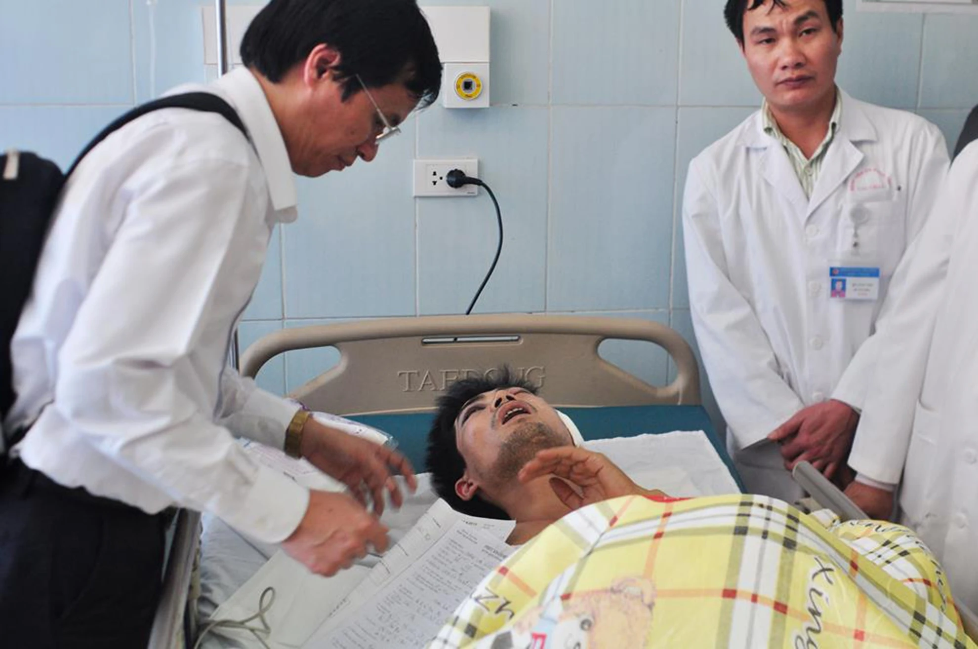 Ông Nguyễn Tiến Quyết (Phải) có mặt tại bệnh viện đa khoa tỉnh Lai Châu chẩn đoán và điều trị cho nạn nhân vụ sập cầu treo.