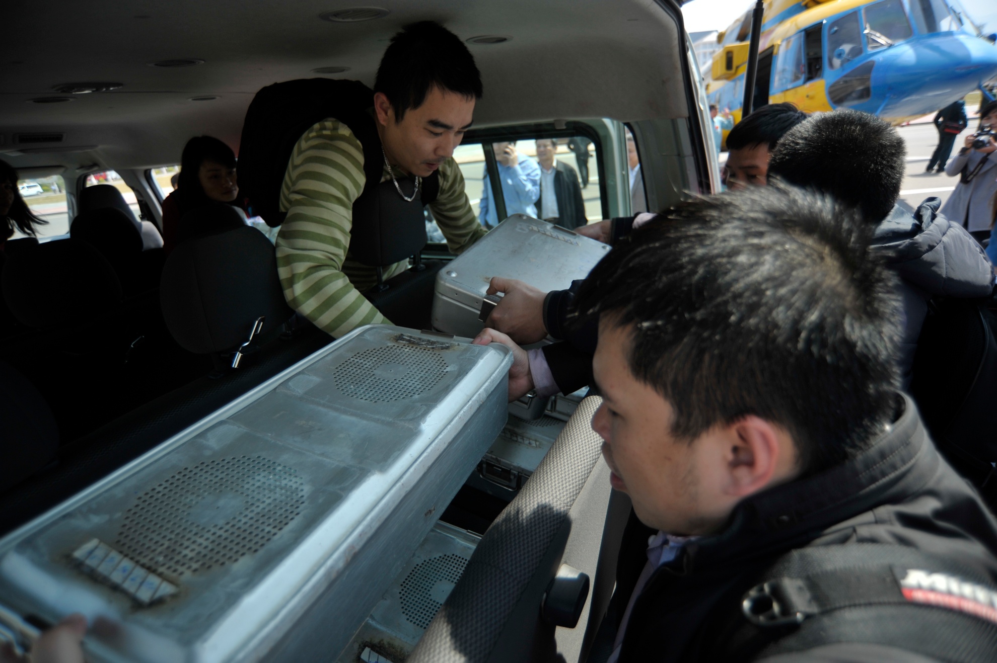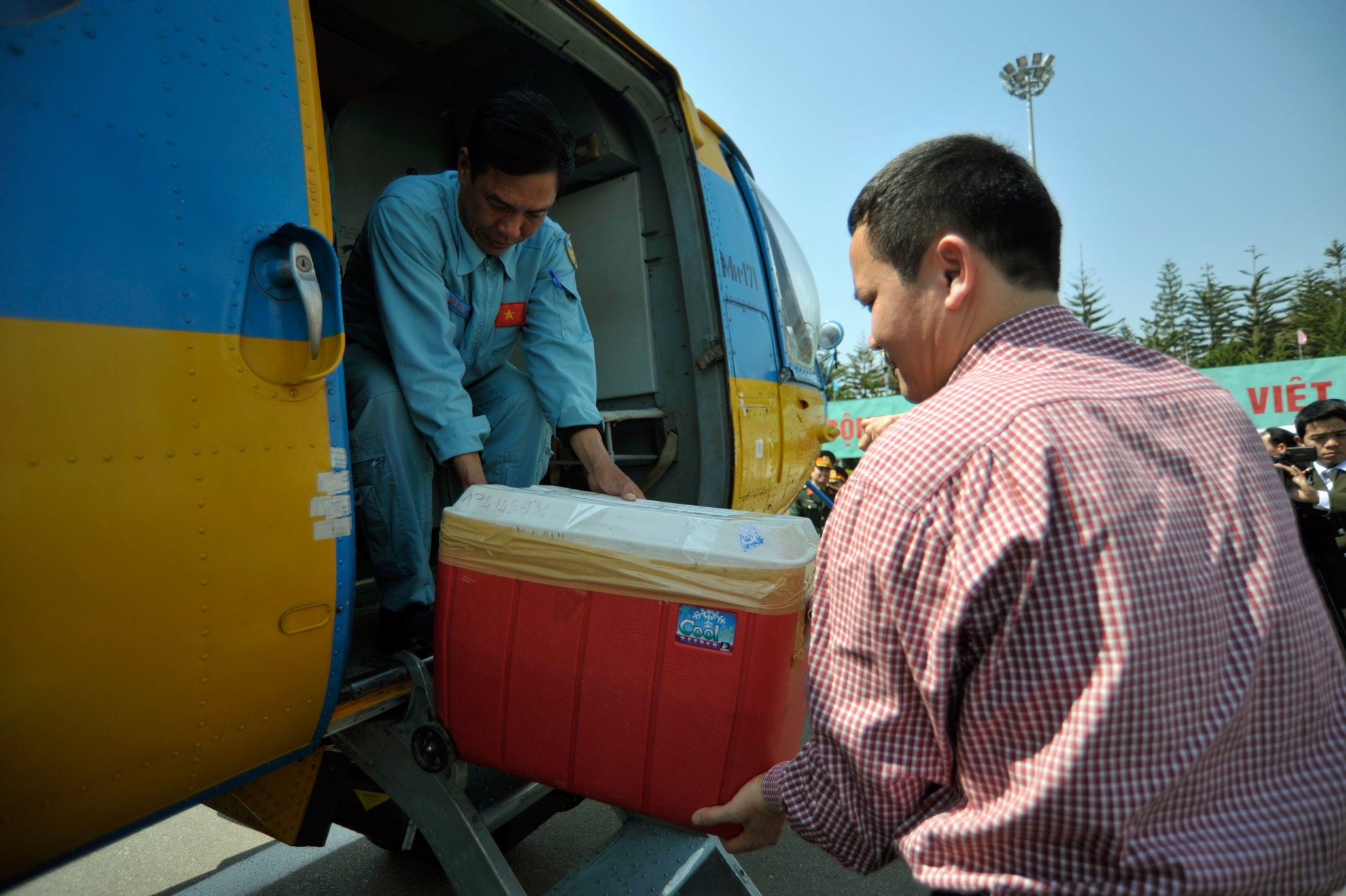 | Đoàn bác sĩ 14 người bệnh viện Việt Đức di chuyển những thùng máu từ trực thăng xuống. |