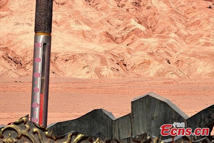 Dụng cụ để đo nhiệt độ ở một trong những nơi nóng nhất trái đất này là chiếc nhiệt kế khổng lồ dựng gần dãy núi. Cơ quan khí tượng địa phương đã nâng mức cảnh báo nắng nóng, nhiệt cao lên màu cam và kêu gọi du khách cẩn trọng.
