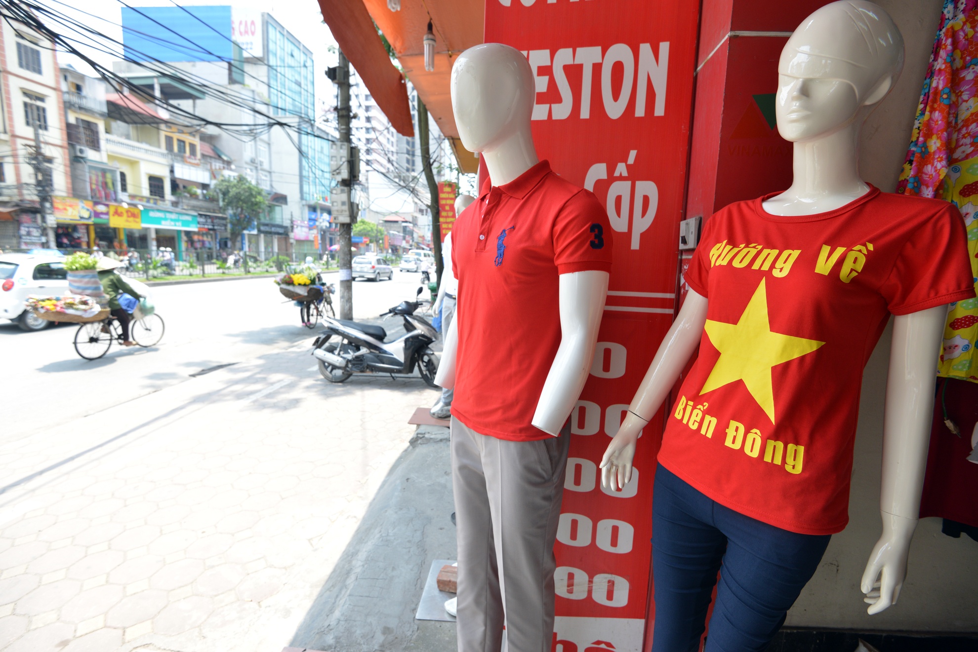 Gần ngã tư Cầu Giấy cũng xuất hiện cửa hàng bán áo với dòng chữ "Hướng về biển Đông".