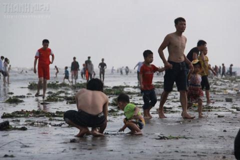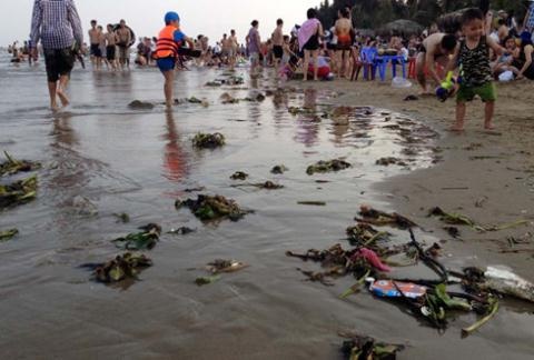 | Rác thải của du khách và bèo tây từ cửa sông Lạch Trường dạt vào khiến một số khu vực thuộc bãi biển Hải Tiến (H.Hoằng Hóa, Thanh Hóa) nhếch nhác. |
