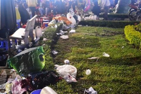 | Du khách để lại "bãi chiến trường" đầy rác ở quảng trường Lâm Viên, Đà Lạt. Ảnh: Gia Bình. |