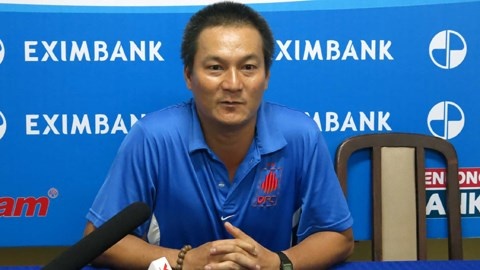 | HLV Ngô Quang Sang của ĐTLA phát biểu đã biết trước việc Quảng Nam sẽ thua An Giang. Ảnh: bongdaplus |