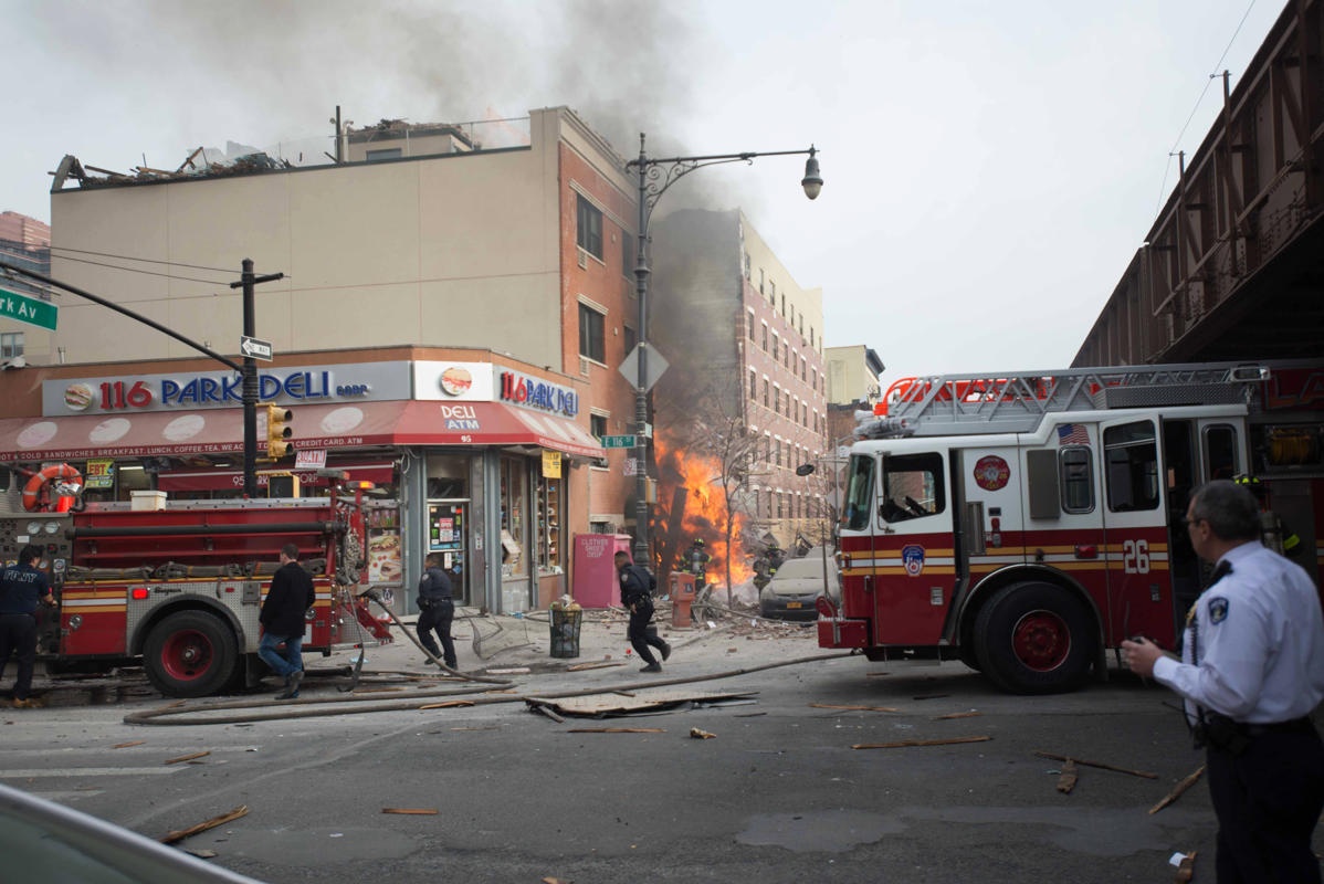 | Lực lượng cứu hỏa, cảnh sát lao tới hiện trường vụ nhà sập trên đại lộ Park và đường 116 để cứu người ngay sau khi thảm kịch xảy ra vào khoảng 9h30 hôm 12/3 theo giờ địa phương. Ảnh: Reuters |