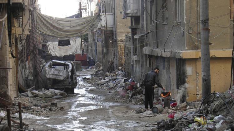 | Một người sống sót nấu ăn cạnh góc tường ở Homs. Ảnh: Reuters. |
