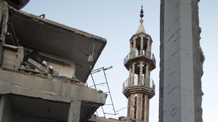 Công trình bằng bê tông sứt mẻ vì bom đạn. Homs là một vị trí chiến lược ở Syria. Năm ngoái, các lực lượng của ông Assad đã tái chiếm nhiều khu vực xung quanh, khiến quân nổi dậy cùng với hàng nghìn người dân mắc kẹt trong thành phố. Ảnh: Reuters.