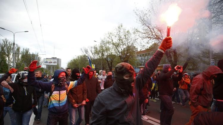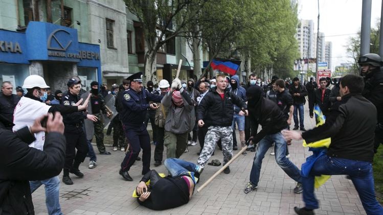 Những người ủng hộ và phản đối chính phủ Ukraina đánh nhau bằng gậy, đá, búa ở thành phố Donetsk khiến ít nhất 10 người bị thương vào ngày 28/4.