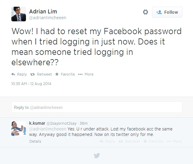 | Một người dùng tại Malaysia chia sẻ trên Twitter về sự cố với tài khoản Facebook, tương tự với những người dùng tại Việt Nam. |