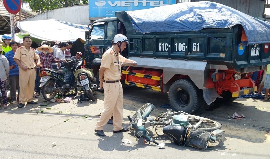 Vừa kịp nhìn về phía có tiếng động, anh Học thấy ôtô ben 5 tấn chạy hướng từ quốc lộ 1 vào hướng Quang Trung đã tông liên hoàn vào 5 xe máy, trong đó có 3 người bị dính vào đầu xe.