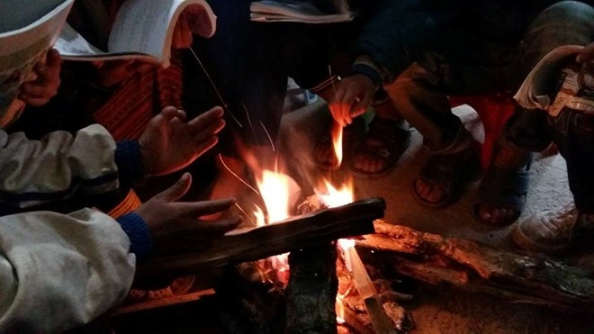 Học sinh Sơn La ôn bài bên đống lửa tránh rét. Ảnh: Ngọc Tân. |