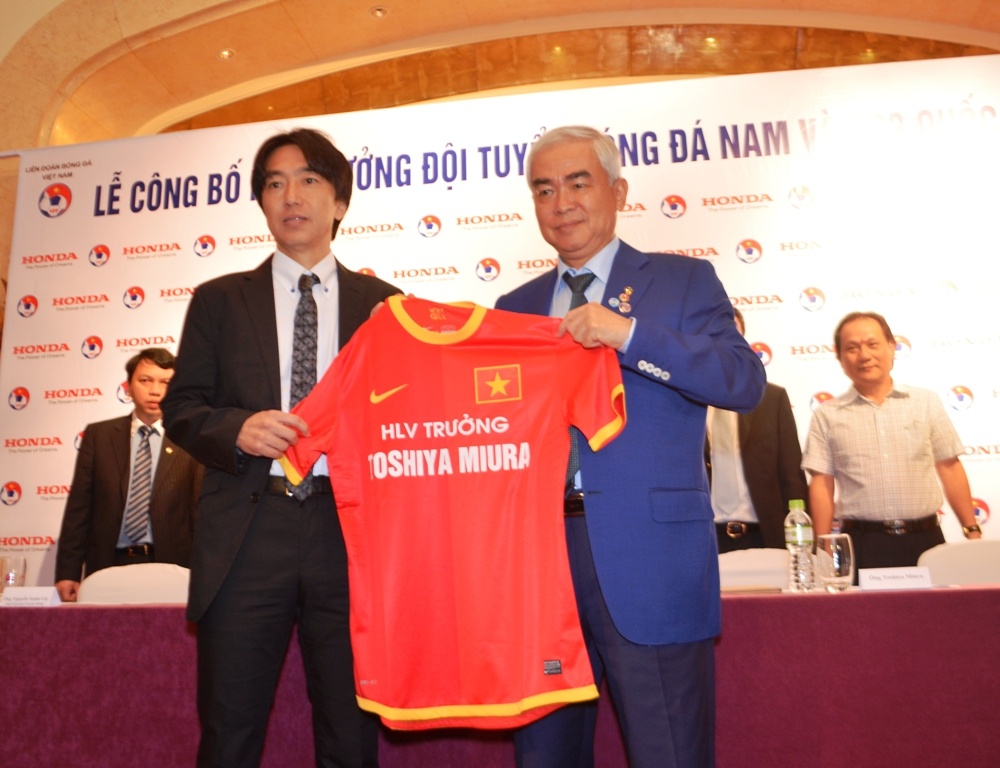 Ngày 10/5/2014, Liên đoàn Bóng đá Việt Nam (VFF) đã tổ chức lễ ký hợp đồng và công bố HLV trưởng ĐT quốc gia và U23 Việt Nam với ông Toshiya Miura. Ảnh: Nguyễn Đăng.