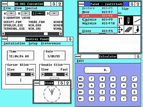 Windows 1.0 (1985) Phiên bản đầu tiên của Windows MS-DOS. Người dùng lần đầu tiên có thể sử dụng chuột để truy cập vào các cửa sổ thay bằng các câu lệnh rườm rà. Tuy nhiên, Windows 1.0 không được sử dụng rộng rãi. |