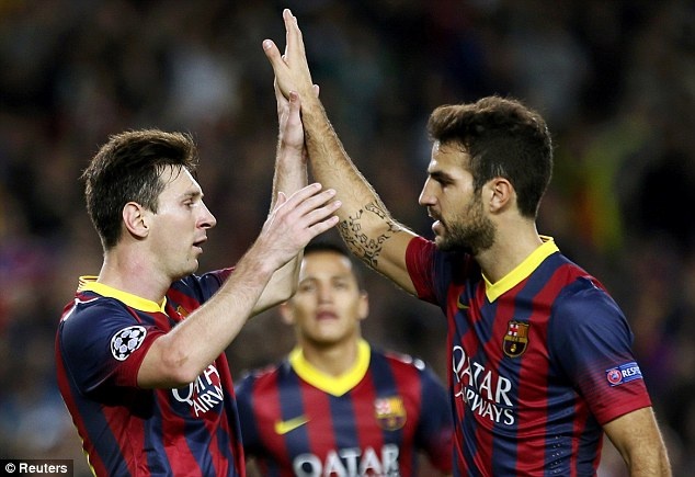 | Messi chia vui cùng người đã kiến tạo cho mình, Cesc Fabregas. |