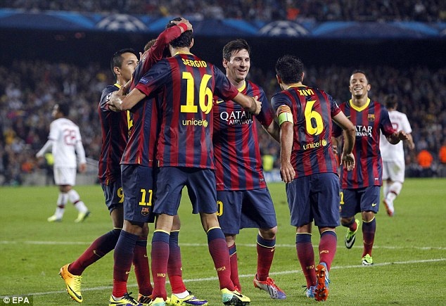 | Niềm vui của các cầu thủ Barca sau khi dẫn trước đối phương 2 bàn. |