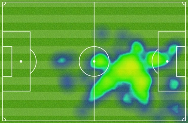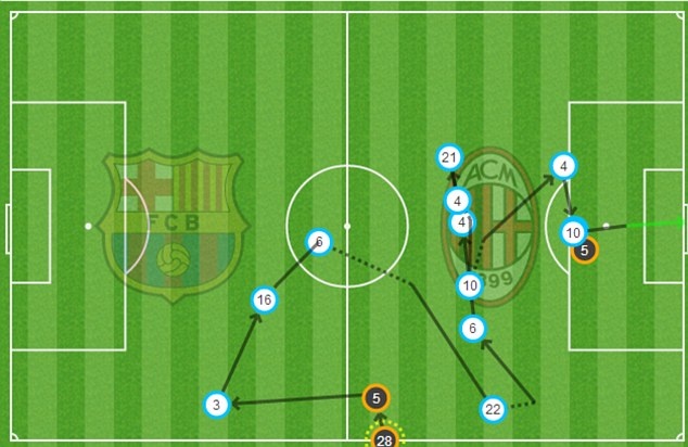 | Khu vực hoạt động của Messi trong trận tiếp đón Milan tại Nou Camp. |