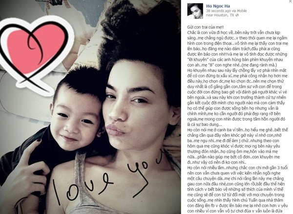 | Bức thư viết gửi Subeo của Hồ Ngọc Hà khi có một số ý kiến không hay về con trai mình của Hồ Ngọc Hà đã làm xúc động cư dân mạng vì tình cảm của nữ ca sĩ với con trai mình. |