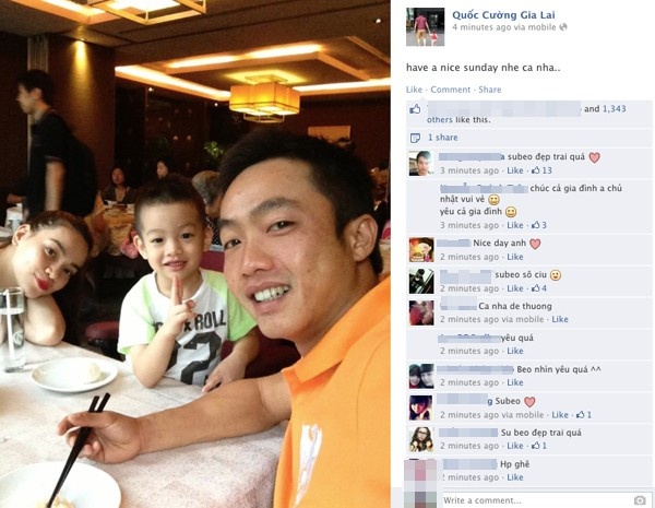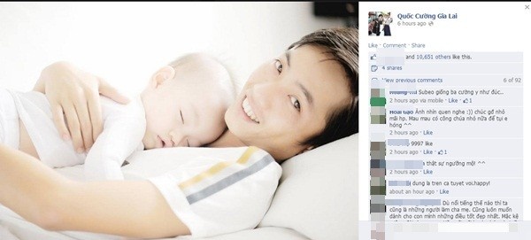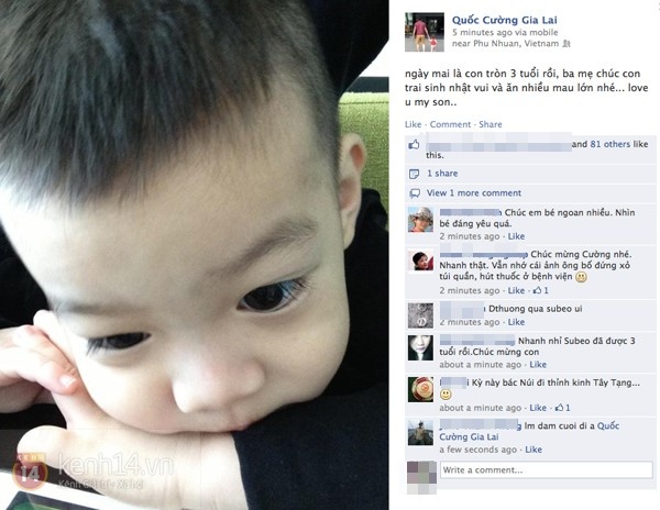 | Cường Đô la cũng chia sẻ một status cảm động khi đến sinh nhật của con trai vào tháng 6: "Ngày mai là con tròn 3 tuổi rồi, ba mẹ chúc con trai sinh nhật vui và ăn nhiều mau lớn nhé... love u my son...". |