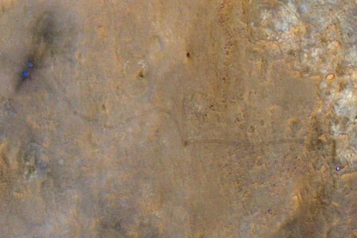 | Dấu vết của Curiosity trên hành tinh đỏ, được chụp lại bởi máy ảnh độ nét cao HiRISE trên vệ tinh Reconnaissance Orbiter của NASA. |