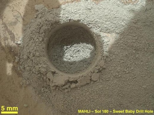 | Bột đá lần đầu tiên được thu thập trên sao Hỏa sau khi máy khoan chuyên dụng của Curiosity khoan xuống bề mặt hành tinh đỏ để lấy mẫu vào ngày 20/2/2013 |
