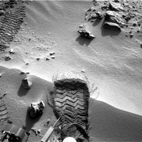 | Bức ảnh Curiosity tự chụp dấu vết mà bánh của nó tạo ra trên bề mặt sao Hỏa |