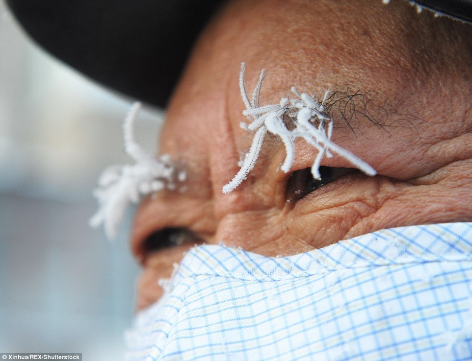 Tuyết và sương giá đọng trên mũ và tóc của một người đàn đông ở Cáp Nhĩ Tân, tỉnh Hắc Long Giang. Các trường học ở nhiều tỉnh thành đã bắt đầu kỳ nghỉ đông sớm hơn vài ngày so với kế hoạch. Tại tỉnh Hồ Nam, chính quyền đã yêu cầu các công trình xây dựng ngoài trời tạm ngưng làm việc trước khi đón những trận bão tuyết và rét nghiêm trọng. Ảnh: REX |