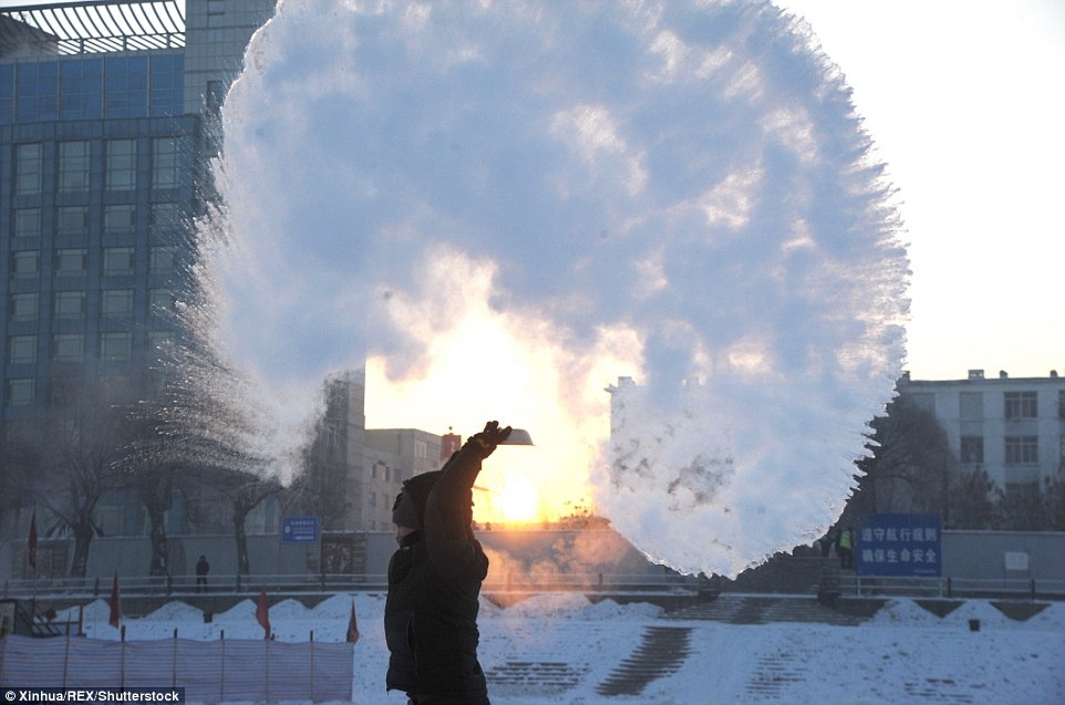 Nhiệt độ xuống thấp đến mức nước nóng cũng lập tức đóng băng khi được hắt lên cao. Bộ Nội vụ Trung Quốc ngày 21/1 đã ban hành thông tư yêu cầu chính quyền địa phương sắp xếp trạm cứu trợ, nơi trú ẩn tạm thời và chăm sóc đặc biệt những người gặp vấn đề về sức khoẻ. Ảnh: Xinhua |