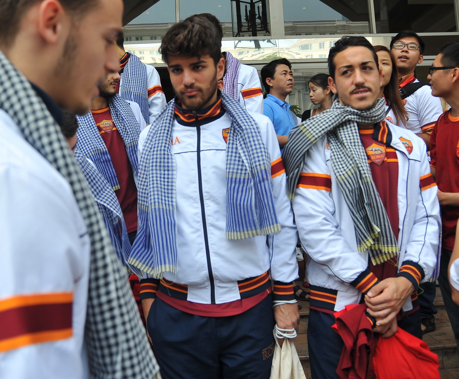 | Fan ruột của CLB AS Roma tận tay đeo khăn rằn Nam Bộ tặng các cầu thủ đến từ nước Ý. |
