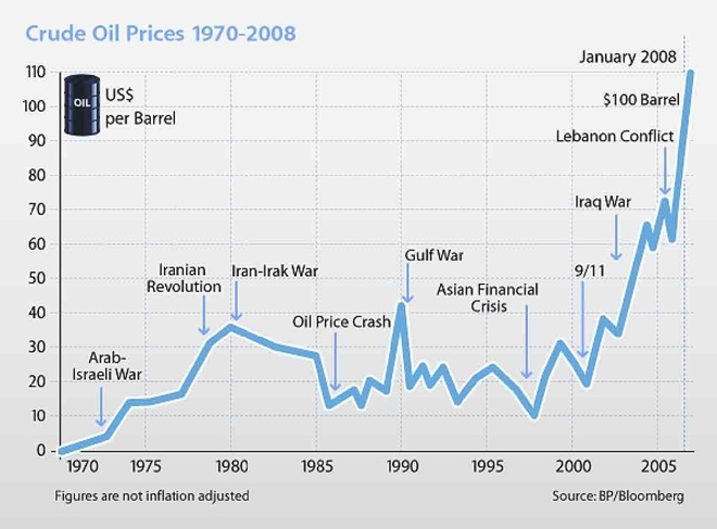 Vào những năm 1980, giá dầu sụt giảm cùng với việc doanh thu từ dầu mỏ bị hoàng gia bòn rút khiến kinh tế Qatar đình trệ. Cuộc khủng hoảng buộc nước này phải tăng cường phát triển mỏ North Field vào năm 1989, dù sau đó sản lượng vẫn ở mức thấp.Trong ảnh là biểu đồ sản lượng dầu thô của Qatar biến động theo các sự kiện kinh tế, chính trị khu vực từ năm 1970 đến 2008. |