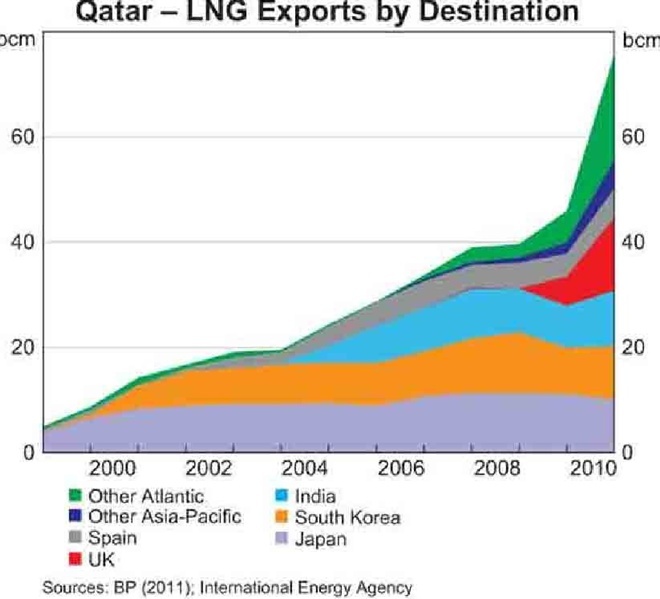 Năm 2006, Qatar vượt qua Indonesia, trở thành nước xuất khẩu khí gas lỏng tự nhiên lớn nhất thế giới. Doanh thu từ dầu mỏ và khí gas chiếm 60% GDP của nước này. Tuy nhiên, Qatar cũng phải đối mặt với nhiều cạnh tranh khi sản lượng khí gas lỏng tại nhiều nước như Mỹ và Australia cũng đang tăng mạnh. |