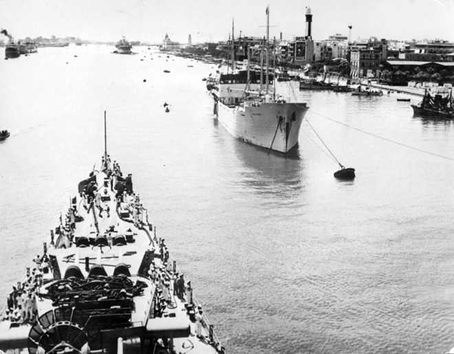 Năm 1971, Qatar giành độc lập sau khi Anh tuyên bố rút quân khỏi phía đông kênh đào Suez. Trong ảnh là kênh đào Suez năm 1951. |