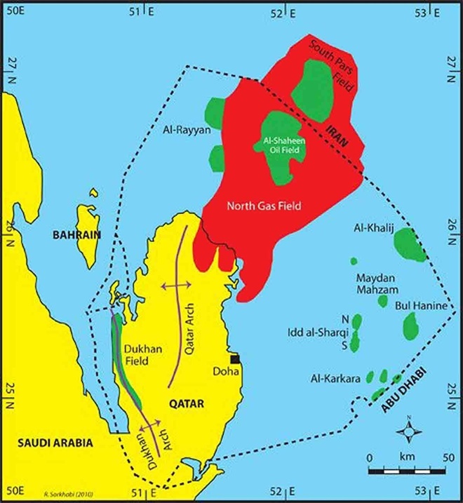 Năm 1971, mỏ khí gas tự nhiên lớn nhất thế giới, South Pars/North Dome, được phát hiện ngoài khơi Qatar. Khi đó, sản lượng xăng của Qatar vẫn ở mức cao, vì vậy, mỏ này chưa được khai khác. |