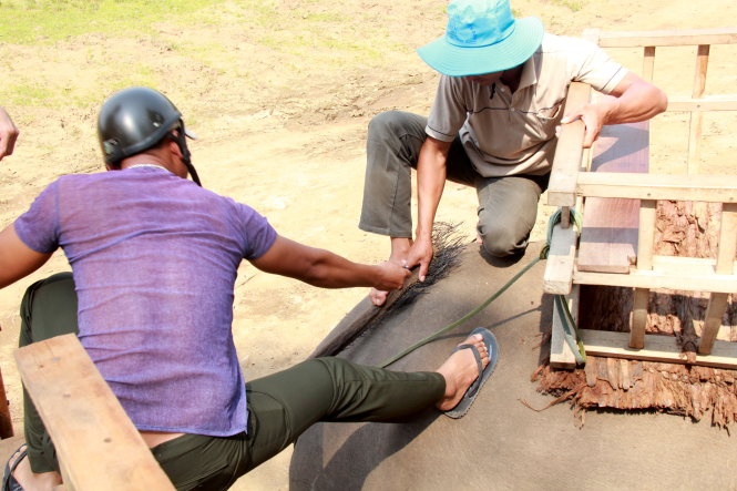 Anh này kêu một nài đưa voi sát vào đài để người này qua chọn lông đuôi voi. Khi voi đã đứng sát đài, nài tuột xuống phía sau, kéo đuôi voi lên lưng và rút trong túi quần ra một cái bấm móng tay lớn.