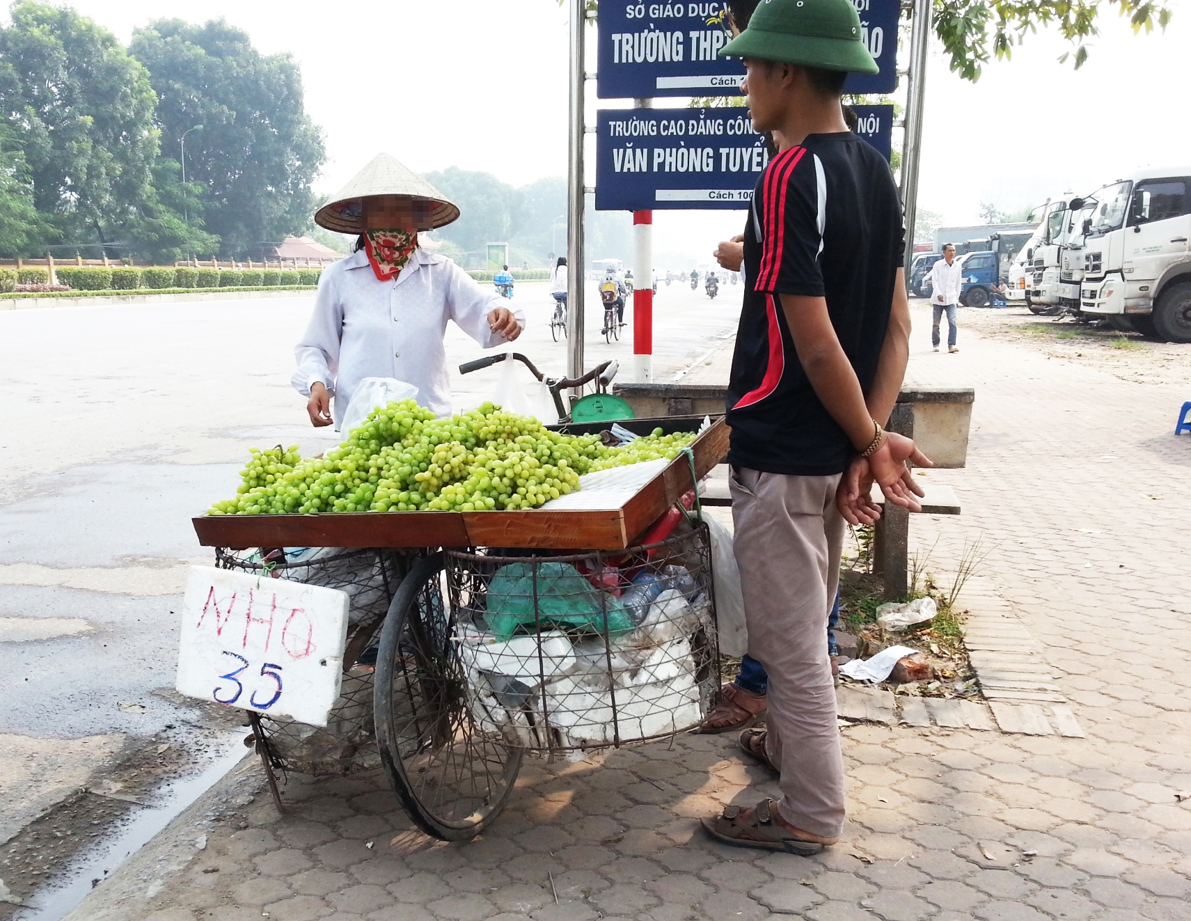 Dọc đoạn dường Hồ Tùng Mậu, Cầu Diễn (Bắc Từ Liêm, Hà Nội), có khoảng gần 10 sạp hàng bán nho xanh trên xe đạp, hầu hết các hàng đều ghi sẵn giá 35.000 đồng/kg. Tất cả nho xanh đều là loại không hạt, được bán theo chùm, loại quả rời được bán rẻ hơn 1 nửa. Quan sát kỹ, thường thấy nho đã ngả màu vàng nhạt, phần đầu quả màu trắng đục, cuống thâm.