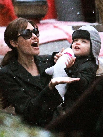 | Hai mẹ con Angelina – Knox hào hứng đón tuyết rơi trên đường phố Paris – Pháp vào một ngày mùa đông tháng 12 năm 2010. |