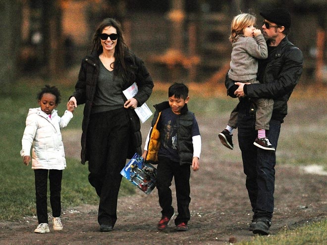 | Trong thời gian quay bộ phim đầu tay với tư cách đạo diễn In the Land of Blood and Honey ở Budapest – Hungary, Angelina đưa người tình Brad Pitt cùng các con tới đây. Trong ảnh là cặp đôi và 3 đứa con Pax, Shiloh và Zahara đang đi dạo. |