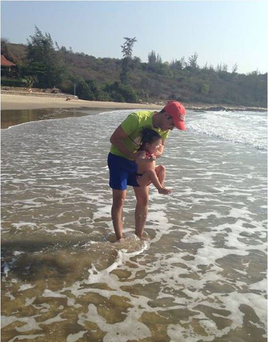 | Bé Cát, con gái của vợ chồng Huy Khánh – Mạc Anh Thư được bố mẹ đưa đi tắm biển. Tuy nhiên, vì còn nhỏ nên bé rất sợ nước và không dám đặt chân xuống nước. |