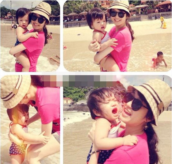 | Người đẹp Mi Vân từng cho con gái Bào Ngư diện đồ bơi đi biển ngay từ khi còn nhỏ. Cũng như nhiều em bé khác, Bào Ngư rất sợ và khóc mếu mỗi khi mẹ cho xuống nghịch nước. |
