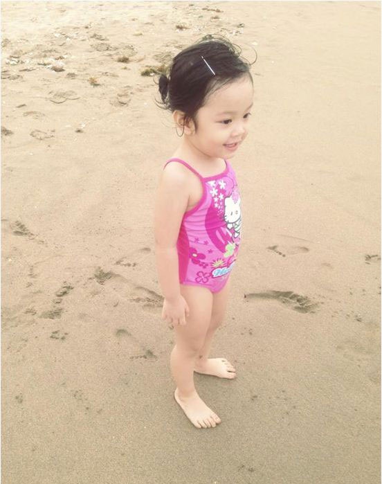 | Bé Sumo, công chúa đầu lòng của vợ chồng MC Rung chuông vàng Diệp Chi và Trung Kiên dễ thương khi đi tắm biển. Cô bé diện bộ đồ bơi liền màu hồng đáng yêu. |