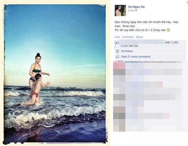 | Là một trong những ca sĩ đắt show nhất nhì làng giải trí Việt song Hồ Ngọc Hà vẫn luôn sắp xếp thời gian để dành cho gia đình. Cô từng chia sẻ: "Sau những ngày làm việc, chỉ muốn thế này, mộc mạc và thoải mái" khi đăng tải bức hình hai mẹ con đang nô đùa trên biển. Trong hình, bé Subeo mặc chiếc quần bơi màu đỏ nắm tay mẹ Hà Hồ tung tăng chạy. |