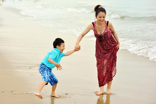 | Hoa hậu, MC Jennifer Phạm cười rạng rỡ khi cùng con trai ra biển. |