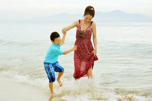 | Hai mẹ con người đẹp Thu Hương chụp ảnh khi đi du lịch biển. |