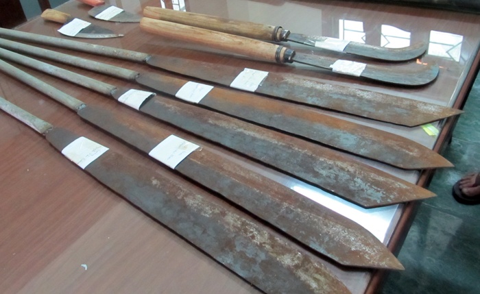 | Nhiều loại dai, đao được thu giữ trong phòng trọ. Ảnh: Việt Đức. |
