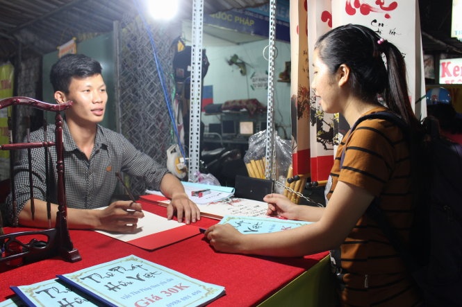 Tết người ta thường mua chữ để chưng tết. Hiểu được điều đó, bạn Nguyễn Hữu Việt (sinh viên năm 3, ĐH Thể dục thể thao TP HCM), một người có niềm đam mê viết thư pháp ngay từ khi còn học lớp 8, đã thuê một góc nhỏ ở chợ đêm làng đại học quận Thủ Đức để viết thư pháp. Không chỉ bán ở chợ đêm, bạn còn bày bán các sản phẩm của mình tại nhà.
