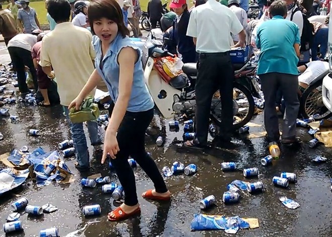 Hôi bia của xe tải gặp nạn. Ngày 4/12, xe tải chở 1.500 thùng bia đi từ TP.HCM ra TP. Phan Thiết, khi đến vòng xoay Tam Hiệp (TP. Biên Hòa) bất ngờ hàng ngàn két bia đổ xuống đường. Hàng chục người xung quanh khu vực lao vào cướp bia trước sự bất lực của tài xế và sự bức xúc của cộng đồng. Xem : Cận cảnh người dân tranh nhau hôi của khi ô tô gặp nạn.