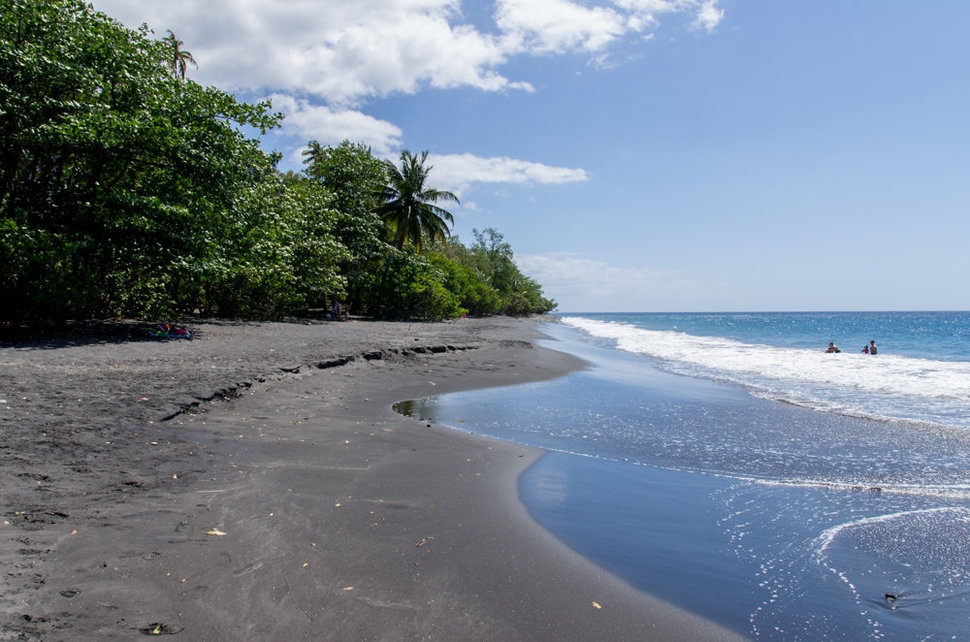 Bãi biển Anse Céron, Martinique, Caribbea: Màu đen như than của cát tương phản với màu xanh của rừng già và những cây dừa trĩu quả, tạo ra phông nền hoàn hảo cho bãi biển biệt lập này. Anse Céron nổi tiếng với dịch vụ lặn biển, bạn có thể tìm thấy nhiều cửa hàng đồ lặn nằm dọc bờ đá gập gềnh này.