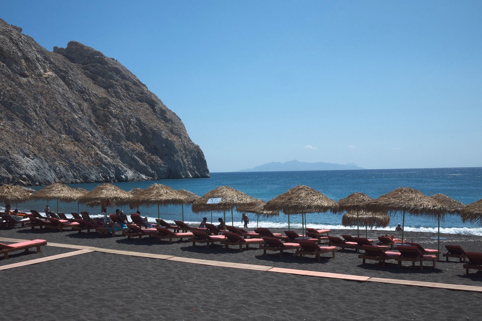 Bãi biển Perissa, Santorini, Hy Lạp: Dải cát đen như màn đêm tương phản với những ngôi nhà màu trắng và làn nước xanh biếc khiến bãi biển này trở nên nổi tiếng với du khách tới đảo Santorini.