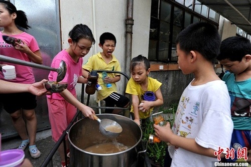 | Bữa trưa với món cháo. Xinhua để các anh chị lấy đồ ăn trước. |