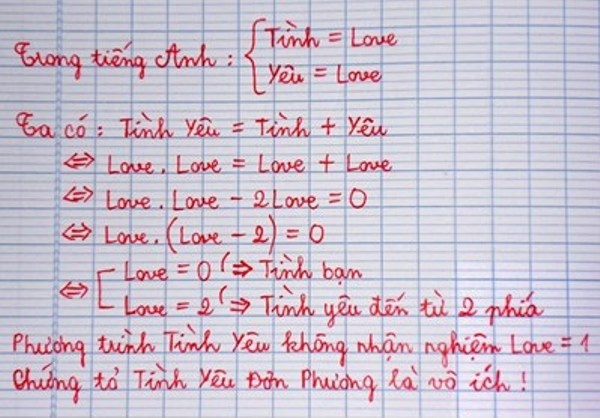 | Tình yêu của tôi là vô cực, giới hạn của nó là 0, vậy đáp án mà con tim bạn dành cho tôi là gì? Đó là ản ý câu hỏi yêu đương thông qua những phép toán. |